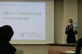 はじめに野田敦敬学長から開会のあいさつが述べられた後、南山大学教職センター相談員の成田健之介氏から「教職キャリアの相談と修了生の姿から見る大学院の役割」と題し、連携協定を活用した同大学在学生への教職キャリア相談や、教職大学院への期待について基調提案をいただきました。
