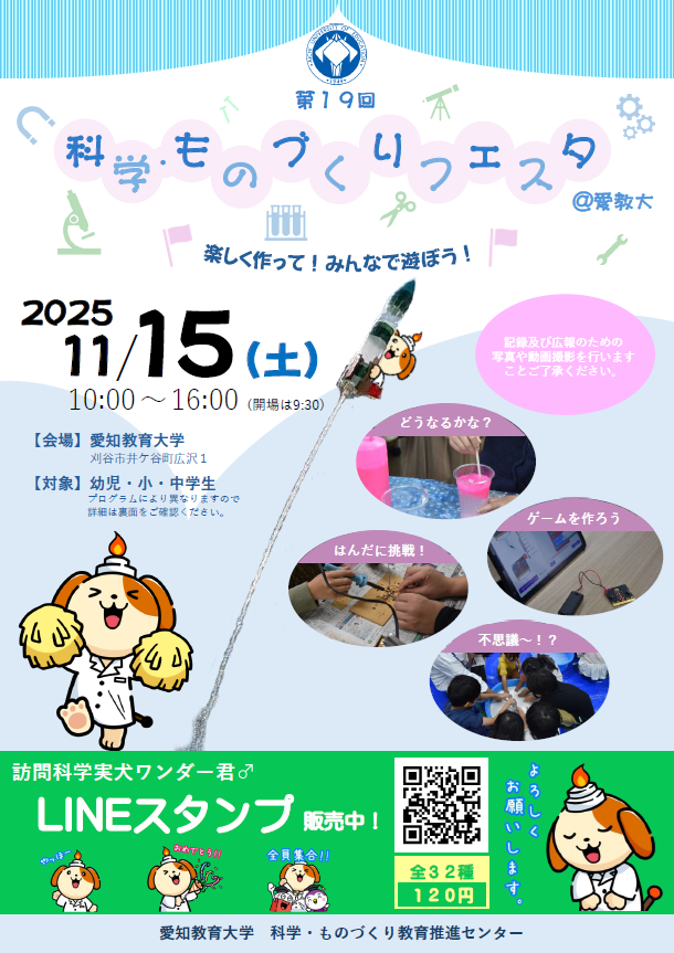 科学・ものづくりフェスタとは、 愛知教育大学の日頃の活動内容を広く社会に紹介すると共に、参加者の方々に科学・ものづくりのおもしろさ・楽しさを実感していただくためのイベントです。 科学・ものづくりフェスタは2007年にスタートしました。 毎年11月の土曜日に、本学で開催しています。 『訪問科学実験』、『ものづくり教室』などの定番のプログラムに加え、本学の教員と学生、本学の卒業生、現役の学校教員、そして、外部の協賛団体による企画もあり様々なコーナーが開設されます。