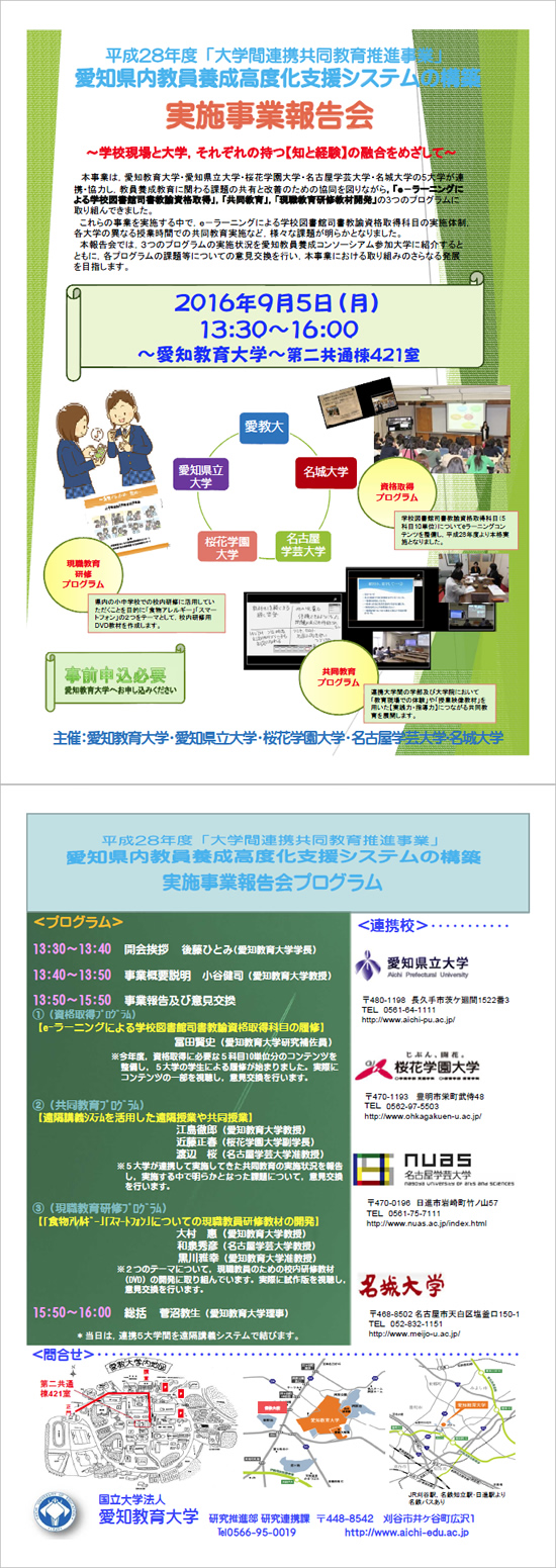 | 内容・プログラム | 愛知教育大学・愛知県立大学・桜花学園大学・名古屋学芸大学・名城大学の5大学が連携・協力して取り組んだ,教員養成教育に関わる課題の共有と改善のための実施プログラムの報告会です。