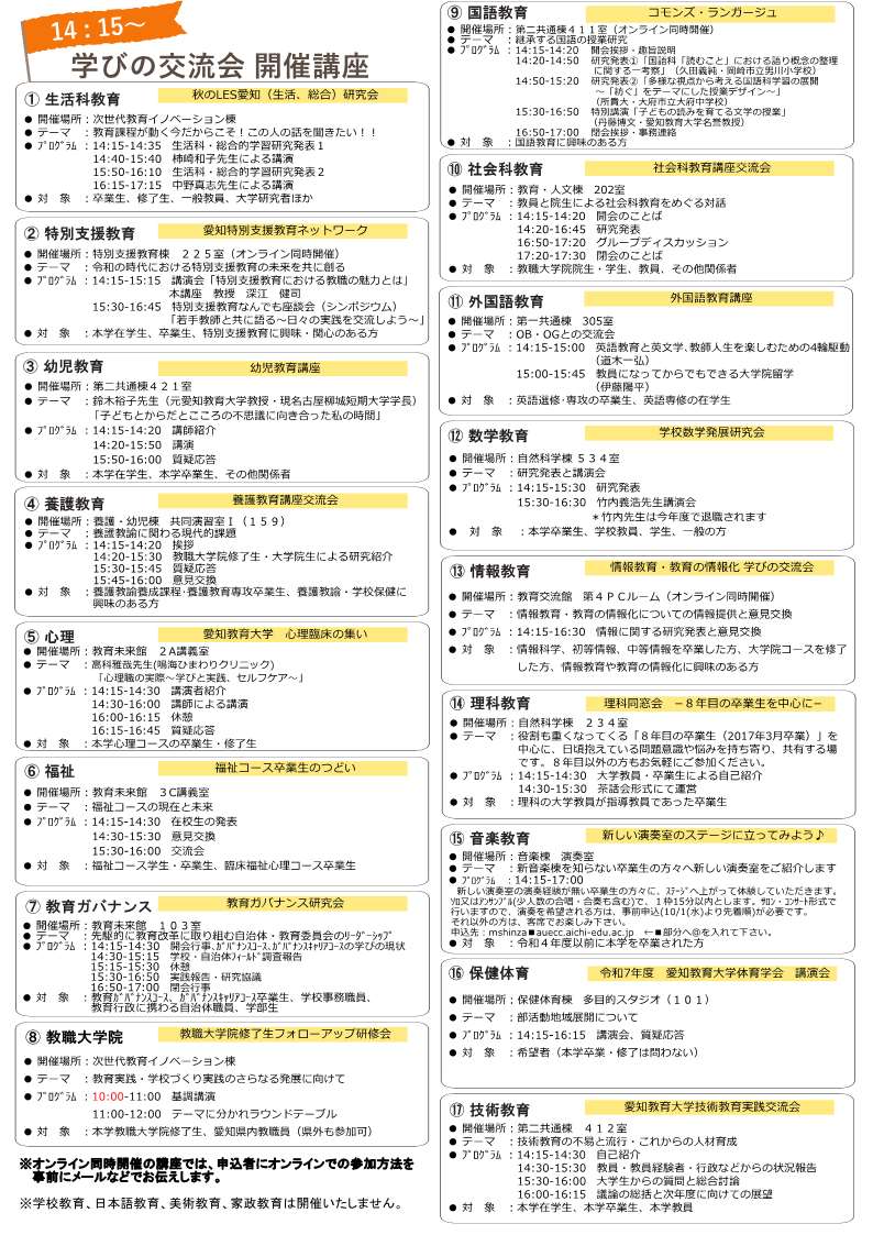 | 内容・プログラム | 13:00~14:00 全体会(本部棟3階第一会議室) 14:15~ 学びの交流会 11:00~17:00 附属図書館自由見学 12:15~14:30 愛教大ミニ物産展 (詳細はチラシをご覧ください。) ※当日の様子を写真や動画で撮影することがあります。撮影した写真や動画はホームカミングデー広報のためホームページや紹介動画で利用することがありますのでご了承ください。 〇生協の営業について ホームカミングデー当日の生協(売店eM)の営業時間は、12:00~14:30です。(食堂の営業はありません。) 〇学びの交流会「⑮音楽教育」について 演奏を希望される方は、別途事前申込が必要です。それ以外の方は、客席でお楽しみ下さい。 (申込方法) 10/1(水)より先着順で受け付けます。 申込先:mshinza■auecc.aichi-edu.ac.jp ←■部分へ@を入れて下さい。 |