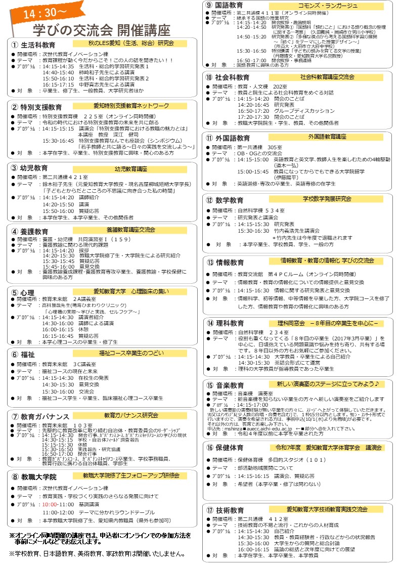 内容・プログラム | 13:00~14:00 全体会(本部棟3階第一会議室) 14:15~ 学びの交流会 11:00~17:00 附属図書館自由見学 12:15~14:30 愛教大ミニ物産展 (詳細はチラシをご覧ください。) ※当日の様子を写真や動画で撮影することがあります。撮影した写真や動画はホームカミングデー広報のためホームページや紹介動画で利用することがありますのでご了承ください。 〇生協の営業について ホームカミングデー当日の生協(売店eM)の営業時間は、12:00~14:30です。(食堂の営業はありません。) 〇学びの交流会「⑮音楽教育」について 演奏を希望される方は、別途事前申込が必要です。それ以外の方は、客席でお楽しみ下さい。 (申込方法) 10/1(水)より先着順で受け付けます。 申込先:mshinza■auecc.aichi-edu.ac.jp ←■部分へ@を入れて下さい。 |