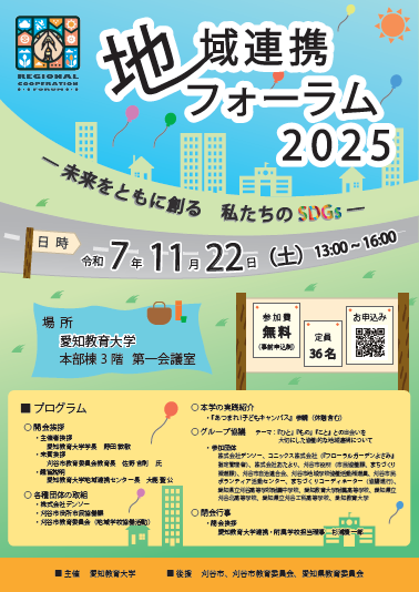 | 内容・プログラム | 愛知教育大学のある刈谷市内の企業、自治体、教育機関それぞれが行うSDGs推進のための実践発表やグループ協議を通じ、協働的で持続可能な地域連携のあり方について考えます。 |