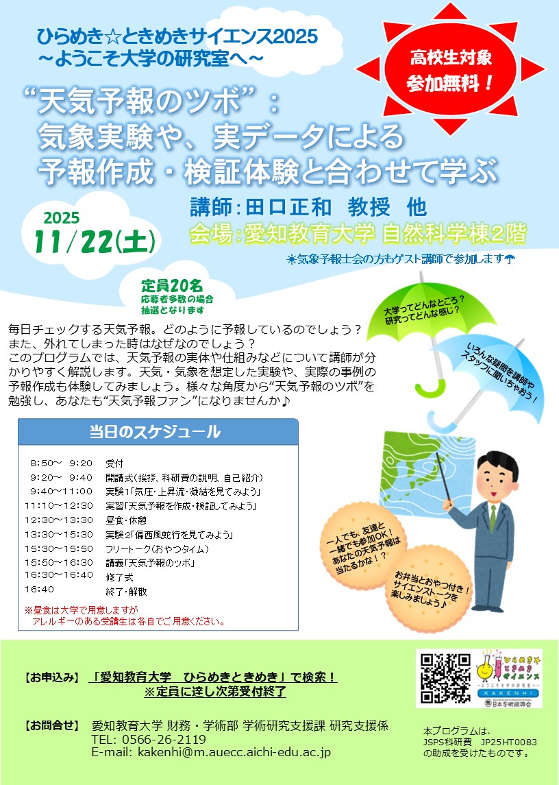 ひらめき☆ときめきサイエンス("天気予報のツボ":気象実験や、実データによる予報作成・検証体験と合わせて学ぶ)