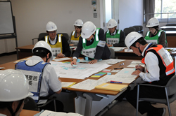 10月26日(月)に,平成27年度総合防災・防火訓練を実施し,学生,教職員合わせて1000人以上が参加しました。今回の訓練では,本学で初めて災害図上訓練を実施し,自衛消防隊組織の副班長以上が参加しました。災害図上訓練とは,10人程度の人数で机を囲み,次々に渡されるカードに書かれた災害状況に対して,対応策を考えていく訓練です。訓練の中で統括管理者を担った福井豊総務企画部長は「次々と与えられる災害状況の想定に対して指示が間に合わず,とても混乱した。実際の災害はさらに混乱することが想像出来たので,良い体験となった」と感想を述べました。最後に,訓練の監督者である白石薫二理事(総務・財務担当)・事務局長・副学長が「災害図上訓練を実施したことによって浮き彫りになった課題を踏まえ,本学の防災体制向上に努めていただきたい」と講評を述べ,災害図上訓練を終了しました。