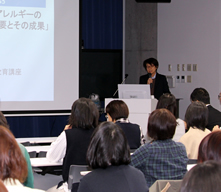 前半は,本学家政教育講座の筒井和美准教授より医教連携による食物アレルギーの教育開発プログラムの概要と成果について報告があり,次いで本学附属名古屋小学校の祖父江 恵栄養教諭より学校現場で実際に取り組んでいる食物アレルギー対応について紹介されました。