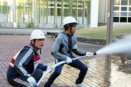 その後,災害対策班初期消火係による消火器の操作説明があり,学生および職員が水消火器による操作訓練を行いました。