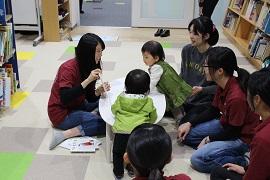 会場では,多くの親子連れが科学実験や不思議な体験,ものづくりなど各ブースを楽しみながら巡り,訪問科学実験オフィシャルマスコットである「訪問科学実犬 ワンダーくん♂」が現れると,多くの子どもたちが一緒に記念撮影を行いました。また,附属図書館での特別企画では,幼児教育選修の学生による絵本の読み聞かせや紙芝居が実施され,10組を超える親子が楽しみました。