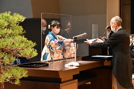 本学吹奏楽団による演奏録音が流れる中、卒業生、修了生が入場し、国歌斉唱では本学混声合唱団による国歌『君が代』の合唱録音が流されました。各課程の卒業生、修了生代表に野田敦敬学長から学位記が手渡されると、大きな拍手が会場を包みました。野田学長の告辞に続き、卒業生、修了生代表から、コロナ禍という制限された環境の中での学びや学生生活の思い出、本学でのさまざまな経験から自分の将来について考えたこと、社会へ巣立つ抱負などが力強く語られました。