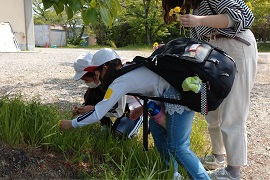 最後に講堂で愛教ちゃんとエディと一緒にクラスごとの写真撮影を行い、大学に自生しているカブトムシの幼虫をお土産としてもらいました。当日はあいにくの曇り空でしたが、子どもたちのすてきな笑顔が学内に広がりました。