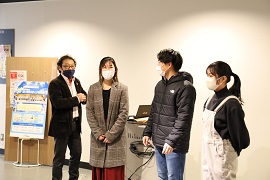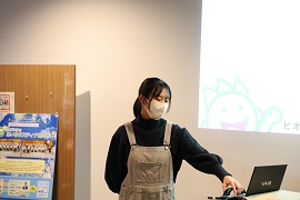 「チーム・コメダ」に参加した教育学部教育支援専門職心理コース1年の中易美月さん、「チーム・加藤建設」に参加した教育学部初等教育理科選修3年の吉岡恋さん、「チーム・サンゲツ」に参加した教育学部初等教育理科選修4年の伊吹明親さんの3人が発表しました。