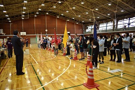 運動会にはたくさんの町民が参加されたため、体育館が少々手狭でしたが、「親子で防災風呂敷」や「空き缶つりで防災水ゲット」など工夫を凝らした種目で盛り上がりました。種目の中には学生が考案したものもあり、「この種目は愛知教育大学の学生が考えました」と紹介のアナウンスが入りました。次の種目の準備や、競技方法の演示など運営の手際もよく、運動会はスムーズに進行しました。