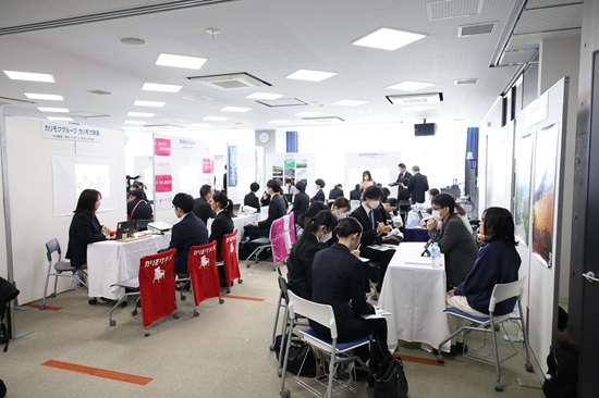 同セミナーは、学生が企業の採用担当者から直接話を聞くことができる就職支援の催しで、2001年度から毎年開催(平成31年度のみ中止)し、今回が22回目。コロナ禍ではオンライン開催でしたが、平成30年度以降、久しぶりの対面開催となりました。今年は2日間合計で延べ200人の学生が来場し、地方自治体や地元有力・優良企業計70の参加団体の採用担当者から説明を受けました。リクルートスーツ姿の学生たちは、開場と同時に希望する企業等のブースを訪れ、担当者からの概要や業務内容の説明に熱心に耳を傾け、真剣な表情でメモをとる姿も見られました。両日ともセミナー終了時間になっても多くの学生が説明を聞いていました。