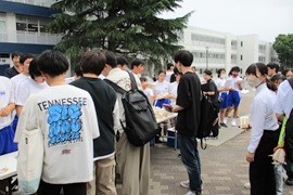 梅雨時期のムシムシとした空気の中、生徒たちが大学に到着すると元気な声と笑顔が辺りを包み込みました。まずは保健体育棟に向かい、多目的スタジオに入ると野田敦敬学長が生徒を笑顔で出迎え、一人一人にあいさつを交わしながらシールを手渡しました。